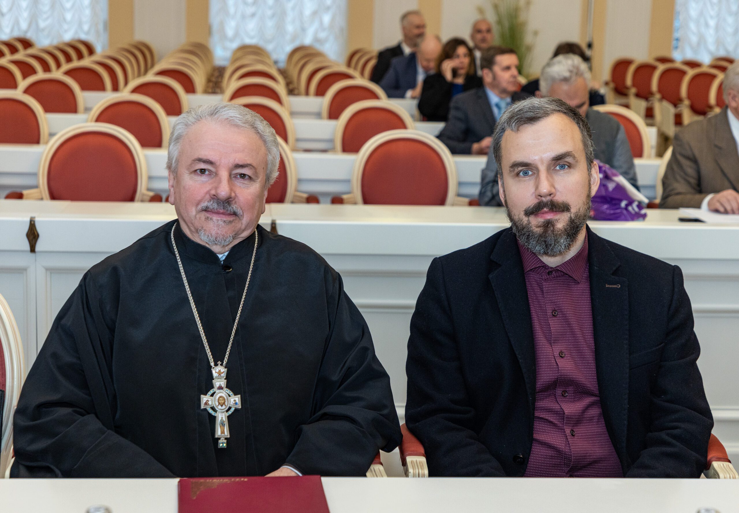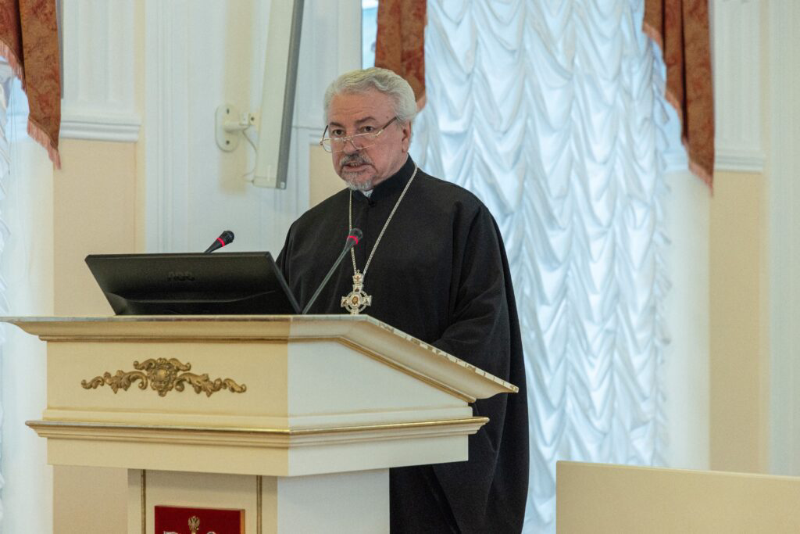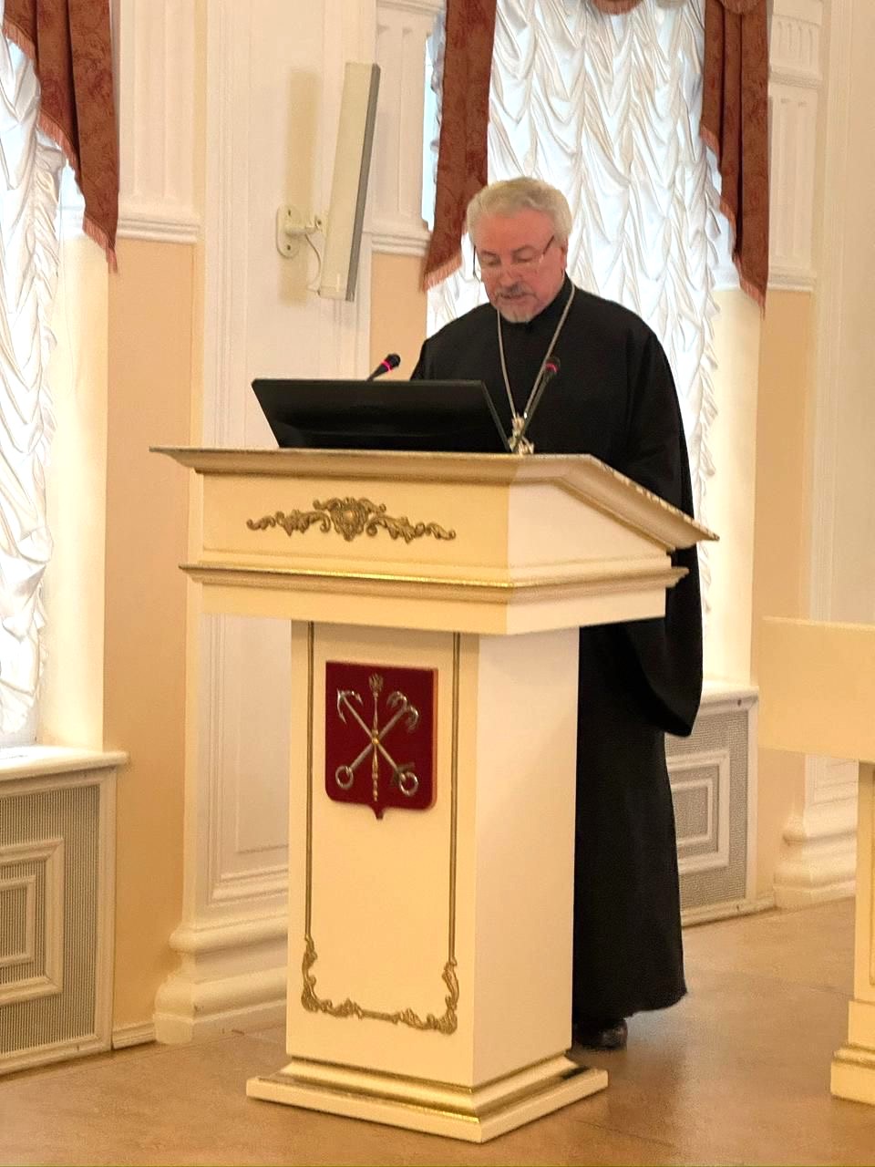 Отец Михаил с особым трепетом огласил приветствие митрополита Санкт-Петербургского и Ладожского Варсонофия, а также передал его благословение участникам форума. Его слова стали духовным ориентиром для всех присутствующих, напоминая о важности сохранения исторической правды и уважения к подвигу наших предков.